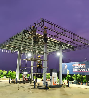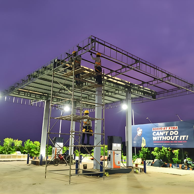 We provide complete end - to - end petrol pump canopy solutions, from the pre-engineered steel frame and metal roofing to the polished 150F flush ceiling. We handle the entire build, delivering a durable, professional, and waterproof station from start to finish.